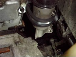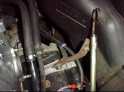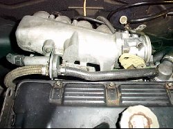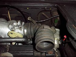 Links am Ansaugkrümmer, direkt neben dem Zylinderkopf der Antrieb der Drosselklappe. Beim 505 würden wir in dieser Ansicht auf die "Feuerwand" also den Fahrgastraum schauen. Der Gaszug muß also auch anders verlegt werden, das Original ist zu kurz und wird durch einen Zug von der Firma Binder&Wörle ersetzt, den es als Meterware gibt. Es handelt sich um eine Flachdrahthülle FDH DIN 71984-2,6-bk-PVC schwarz (Nr. 5.51.0000.220), die mit einem POM-Rohr versehen ist. Damit ist mit einem normalen Litzen-Innenzug eine leichtere Betätigung als ohne Innenrohr sichergestellt. Die Kosten belaufen sich auf ca. 10 DM/m bei einer Mindestabnahmemenge von 10m.