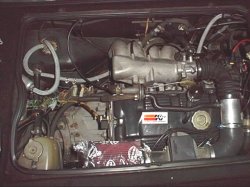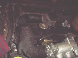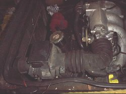 Die Fertigstellung. So sieht die Anlage bis heute aus. Das Adapterstück zwischen den beiden Ansaugluftschläuchen wurde bei Schweizer Race Parts hergestellt und ist eine Sonderanfertigung. Erst muß mal noch einiges am Auto gemacht werden, wie zum Beispiel das Prüfen und gegebenenfalls Austauschen der Einspritzventile, die schon 250'km ihren Dienst geleistet haben. Dann darf der murena aus eigener Kraft zum neuen Abstimmen fahren. Soweit sei gesagt, daß der Motor so schon angesprungen ist! Natürlich ohne Plastiktüte auf dem Luftfilter ;-). Die meiste Arbeit ist damit getan.