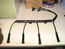Unten in der Mitte (rechts neben dem grünen Stecker des 4. Einspritzventiles) ist der vierkantige Kanal zur Verteilung der Benzinzufuhr zu den Einspritzventilen zu sehen.