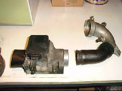 Dieses Bild zeigt den ursprünglichen Ansaugbogen der an der Drosselklappeneinheit befestigt ist und den Luftmengenmesser. Dieser Krümmer wird bei Andreas nicht mehr verwendet, da die Verjüngung von 70 auf 60 und dann wieder auf 70mm zum Luftmengenmesser als unbefriedigend erscheint. Ebenfalls am Luftmengenmesser noch der Ansaugtrichter wie er im 505er Luftfilter befestigt ist. Hierfür bietet RACIMEX passende Adapter an auf den man dann den Universalluftfilter anbauen kann. Es gibt aber auch für die Saugmotorversionen wo dieser Luftmengenmesser Verwendung findet solche Adapter. Von dort aus führt ein Formschlauch zum Luftfilterkasten/Gehäuse.