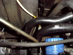 Ebenfalls hier im Bild rechts sehr schön zu sehen ist der Unterdruck-Schlauch der Bremsanlage, noch in Peugeot Original. Hier ist keine Veränderung nötig, dieser läßt sich schön an der Rückwand mittels Kabelbinder befestigen.