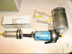 Rechts der Benzinpumpeneinheit der Knecht Kraftstofffilter KL 29 ebenfalls für VW geplant. Dieser Filter ist mit Schraubanschlüßen an beiden Seiten versehen und kann mittels Hohlschraube mit der Benzinleitung verschraubt werden. So ist ein fester Sitz gewährleistet und die Banjos in den Benzinschläuchen werden gekauscht.