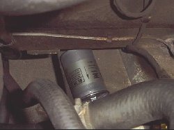 Hier die Benzinfiltereinbaulage an unteren rechten Spritzblech. Der Benzinfilters wird ebenfalls mittels Normaschelle dort befestigt. Der Vorteil dieser Platzierung liegt eindeutig daran, daß beim Ölwechsel der Benzinfilter genauso leicht zugänglich ist, aber bei der Motoransicht nicht gleich in's Auge springt. Dies gilt ebenso für die versteckte Pumpeneinheit.