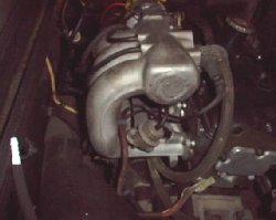 Dies ist ein "Ford" Formschlauch 87 HF-9E 770 CA/DA?. Das Intressante an diesem Formschlauch ist, daß dieser auf der Krümmer-Eingangseite einen Wulst hat, der in die Nut des Drosselklappengehäuses paßt, wo vorher der Gummi O-Ring gesessen hat. Somit ist die Dichtheit gegen Falschluft richtig gewährleistet. Der im Bild sichbare Luftschlauch steuert das am Ansaugkrümmer befestigte Zusatz?-Luftventil. Hier muß noch die "muß" Verwendung geprüft werden, dq a jetzt nicht mehr zwischen Ladedruck und Unterdruck gependelt wird. Anschluß ist linksseitig am Schlauch möglich.