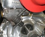 Sehr einfach und wie dafür gemacht ist das Ergänzen des Thermostatgehäses mit einem Temperatursensor. Ein kleiner Ring ist bereits vorhanden, hier muss nur das Gewinde geschnitten werden. Im Bild ein Bosch Temperaturfühler. Wie unschwer zu sehen, sind alle Aluteile gestrahlt, grundiert und lackiert. Leider sind die Aluminiumteile alle mit unterschiedlichen Legierungen und Fertigungsverfahren produziert worden und im Laufe der Zeit unterschiedlich angelaufen/korrodiert. Darum habe ich mich für eine deckende Lackierung in Silbermetallic entschieden.