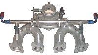 Dank dem abfallenden Einlasskanal ist die Adaptierung des Ansaugkrümmers zum Glück relativ einfach. Es können die Einspritzventile im 35° Winkel in das Saugrohr gebaut werden. Das Ansaugrohr muss nicht mehr vorgewärmt werden, entsprechend kann das Material abgetragen werden. Die einzige Vorwärmung, die hier beim Winterbetrieb nötig ist, ist im Flansch der Drosselklappen integriert.
