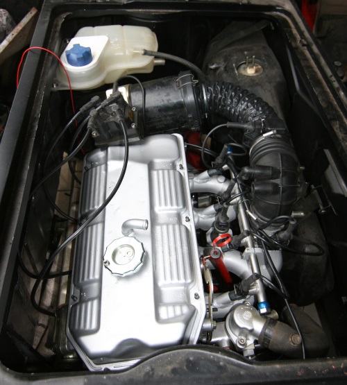 Der Test Zusammenbau des kompletten Einspritzsystemes. Luftfilter, statische Zündung und A4 Kühlwasserbehälter passen gut in den Motorraum.