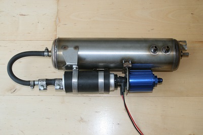Wie schon im Kapitel Tankmodifikationen beschrieben sind wegen der Umrüstung von Vergaser auf Einspritzanlage Anpassungen nötig. Die Benzinpumpe muss immer Kraftstoff ansaugen können, was beim Murena Tank bei niedrigem Kraftstoffpegel nicht sichergestellt ist. Dort ist die Schwimmerkammer der "Catchtank" also erstelle ich anstatt des Unterdruckspeichers einen Edelstahltank mit 1,5l, auf dem auch die Hochdruckpumpe montiert wird. Wie im Kapitel Restauration zu sehen, der Grund für die Stückelei an der Saugleitung. Ich habe mich zuerst auf die Beratung eines Einspritzanlagen Spezialisten verlassen und leider eine unbrauchbare Benzinpumpe bekommen. Da war der Catchtank schon fertig gescheißt und nun ist bei der Pierburg Pumpe 7.21659.70.0 ein 12mm Schlauch nötig. Diese Pumpe wird auch bei Audi verwendet, heute kein Garant mehr für hohe Qualität, aber bestimmt besser, als die FSE Pumpe.